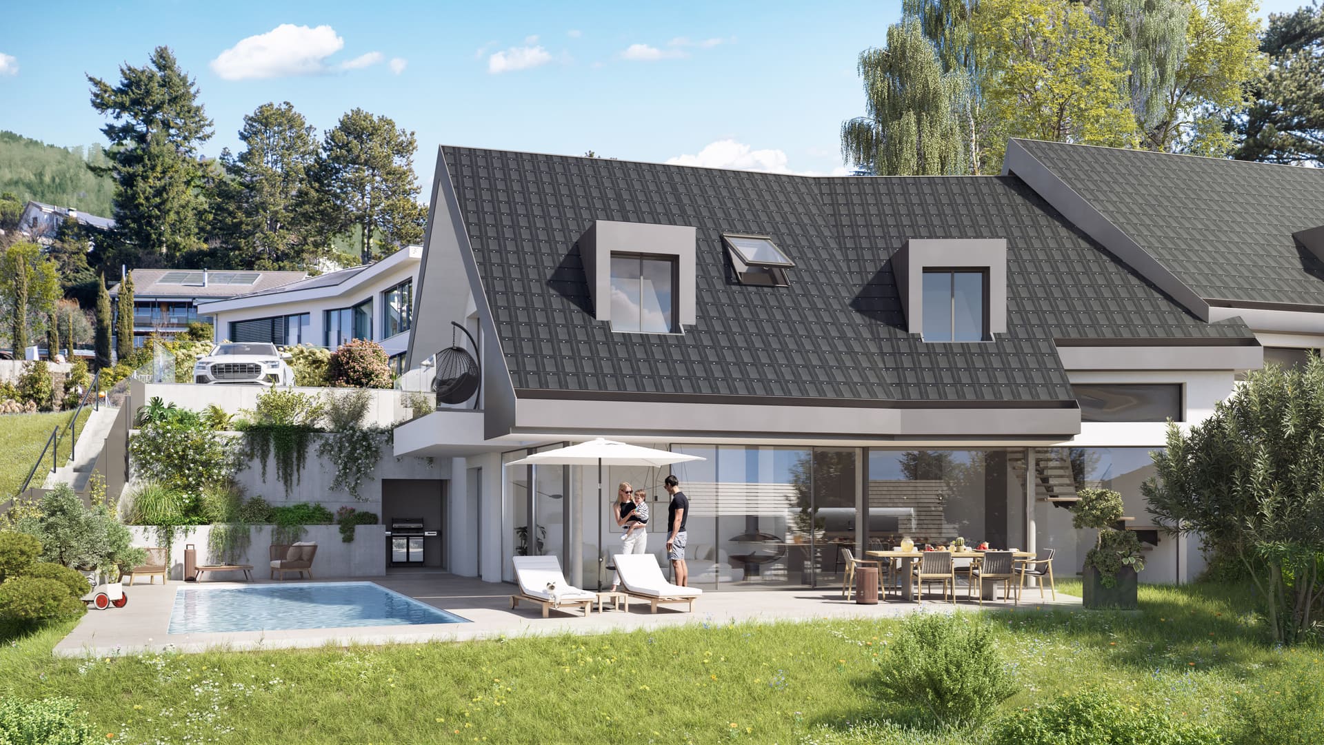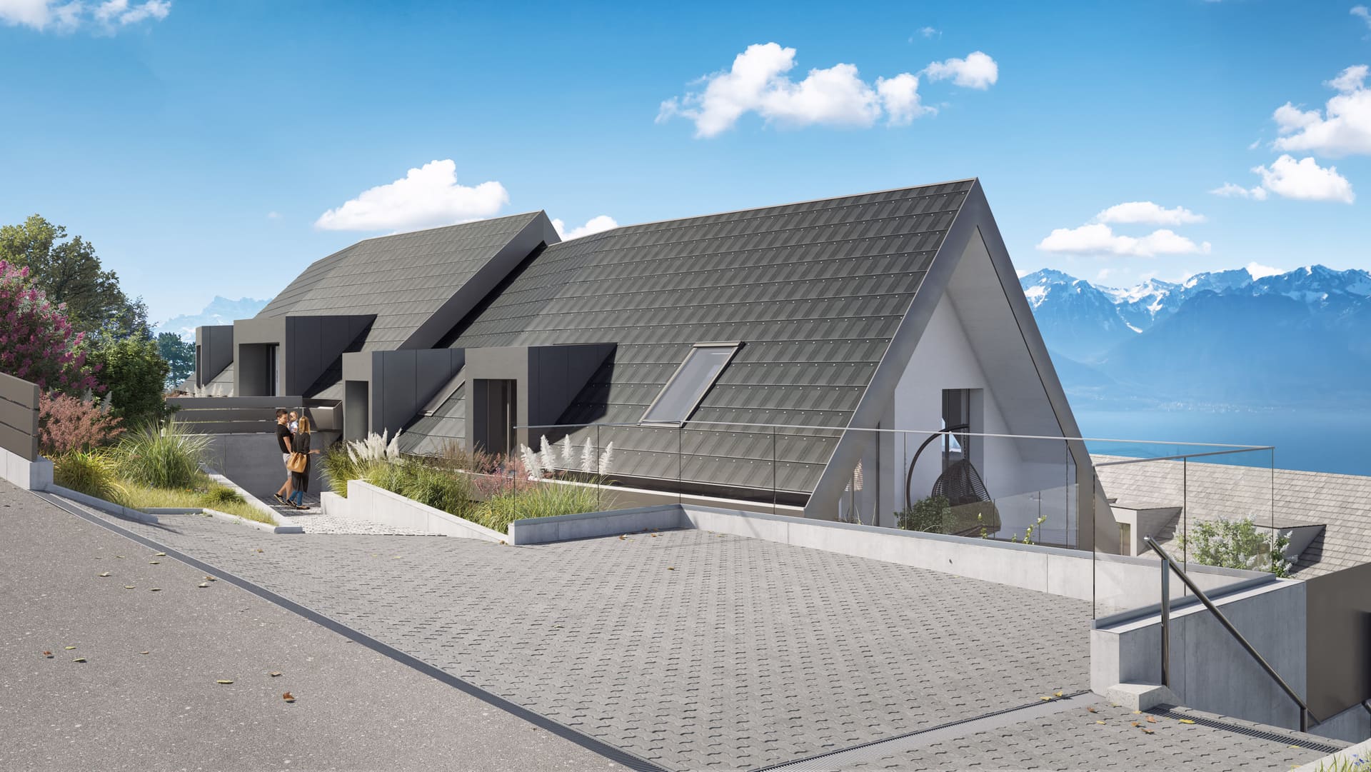L’aboutissement ? Un rêve de deux maisons jumelles, conçues comme deux villas individuelles et implantées sur une parcelle de 1216 m2, au cœur d’un quartier résidentiel de Blonay, dans un cadre d’exception, alliant vue, calme et verdure.