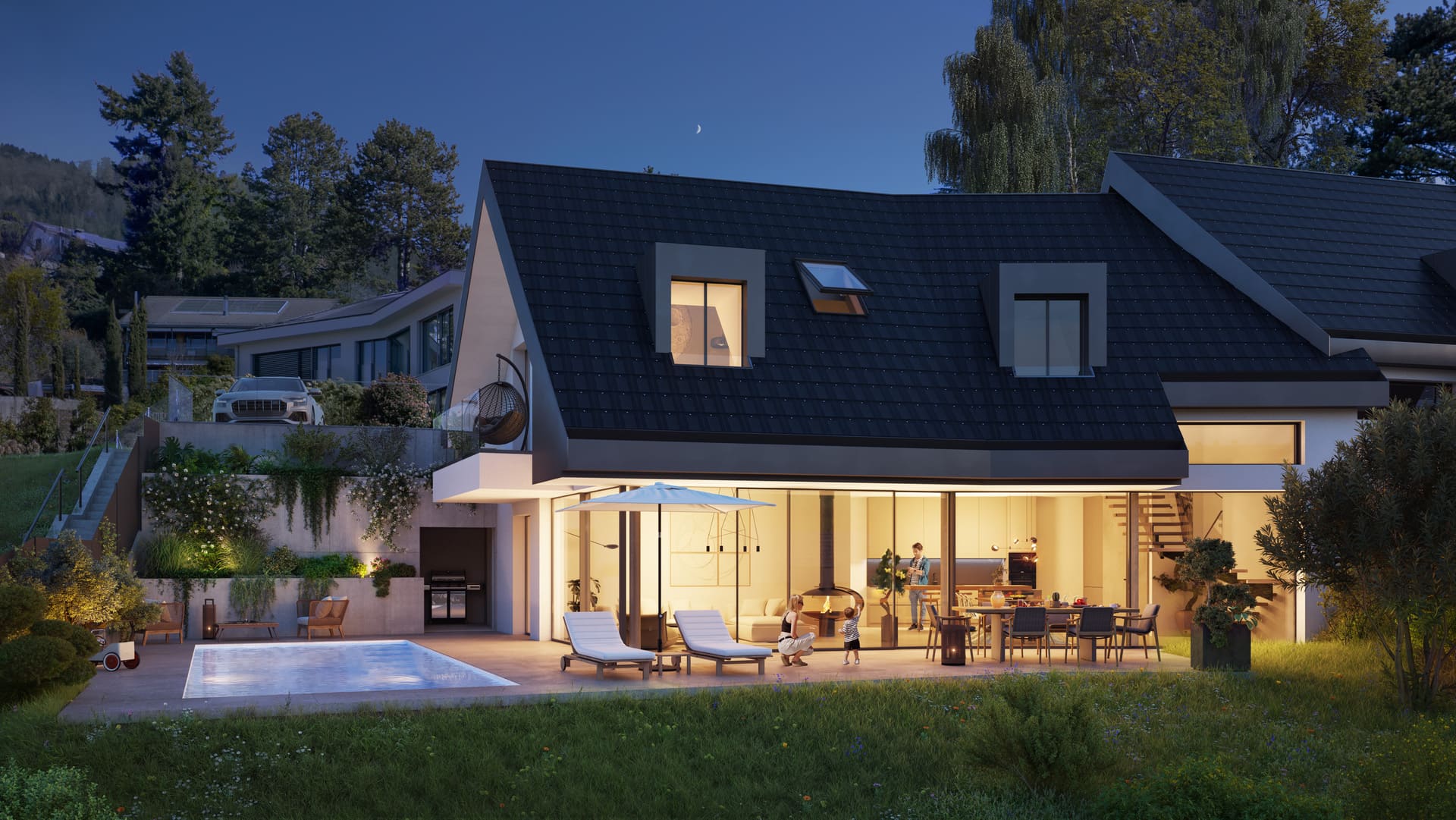 • d’une couverture complète avec des tuiles photovoltaïques d’une capacité d’environ 13 kWp